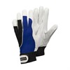 Ofodrad läderhandske i hög kvalitet för monteringsarbeten. Slitstark getnarv 0,7-0,8mm i handflatan och bomull på ovansidan. Förstärkt pekfinger, förstärkta fingrar och tumme. Längd 235-270mm. Cat II. Blå/svart/vit. 12par/bunt.