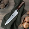 Kockkniv med blad i tre lager stål, uppbyggt av en kombo av hårt och mjukt stål, som ett traditionellt samurajsvärd. Kärnan består av VG5-stål. Stålsorten innehåller en hög andel kol och är mycket hård, vilket gör att eggen kan slipas sylvass. Yttre lager består av mjukare, rosttåligt stål. Hårdhetsgrad 58-59 HRC. Rödbrunt handtag tillverkat av pakkawood, bestående av fanér och specialplast som sammanfogas under högt tryck. Med antibaktereiella egenskaper samt behåller strukturen från träet och ger en svårslagen känsla. Längd 21cm.