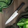 Exklusiv kockkniv från Tamahagane med knivblad uppbyggt av 63 lager stål. Kärnan består av hårt VG5-stål och övriga lager av ett mjukare, mer rosttåligt stål. Det gör att knivarna är extremt vassa och håller skärpan länge. Stållagren har både hamrats och polerats, vilket ger bladet dess vackra damaskusdesign. Hårdhetsgraden är 59–60 HRC. Med knivhandtag tillverkat av micarta. Materialet framställs genom att linneduk och specialplast sammanfogas under högt tryck. Detta ger ett hårt, vattentåligt och hygieniskt material som lämpar sig väl i köksmiljö. I handtaget sitter även en vikt som ser till att kniven är perfekt balanserad. 21 cm.
