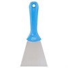 Handskrapa med 100mm rostfritt och flexibelt stålblad med rundade hörn för att skydda ytan. Robust bladfäste och ergonomiskt fingerstöd. Avlägsnar effektivt fastsittande ingredienser och smuts. 100mm. Blå. FDA godkänt material samt godkänd för livsmedelskontakt. Finns även i grön och gul. För övriga färger (vit, röd, rosa, orange, lila) kontakta oss.