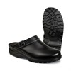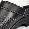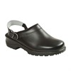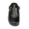 Skyddstoffel med ovandelsmaterial i PU-belagt läder och slitsula i PU, lämplig för användning i huvudsak inomhus. Med ställbar vristrem, stötdämpning och oljebeständig yttersula. Svart. Finns i storlek 35-46.