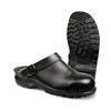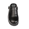 Skyddstoffel med ståltåhätta och ovandelsmaterial i PU-belagt läder och slitsula i PU, lämplig för användning inomhus vid köksarbeten och lokalvård. Med fällbar och justerbar hälrem, stötdämpning och oljebeständig yttersula. Tåhätta i stål. Svart. Finns i storlek 35-46.