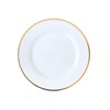 Flat tallrik i fältspatporslin dia 19cm, lämplig till förrätt och dessert. Tål mikrovågsugn, diskmaskin och frys. Vit med guldrand. 24st/fp = minsta beställning.