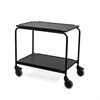 Serveringsbord med 2 hyllplan i storlek 600x400, svartlackerad ställning, skiva i svart laminat. Laminatskivorna är tillverkade i ett stycke med stödkant och nersänkta hörn. Fyra svängbara hjul varav två bromsbara. Max belastning 150 kg. Levereras omonterad. Svensktillverkad. 5 års garanti. Kontakta oss för att se hela utbudet av färger och storlekar.