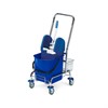 Klassisk svabbvagn med plastpress och hink 25 liter. Utrustad med en st kort samt hållare för skaft. Hjul med stötdämpare varav ett med broms. Mått (LxBxH) 56x40x98cm.