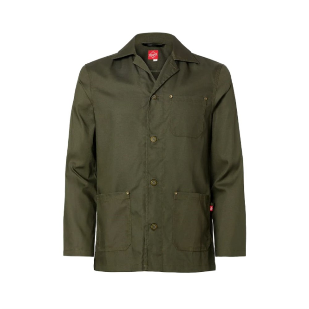 Jacka i unisexmodell med klassisk krage och sidfickor. Längd mitt bak stl M ca 75 cm. Med bröstficka, nyckelhälla, hank i nacken. Material 65/35% återvunnen polyester/bomull (Canvas) vikt 235g/m². Finns i storlek XXS-3XL. Mörk grön.