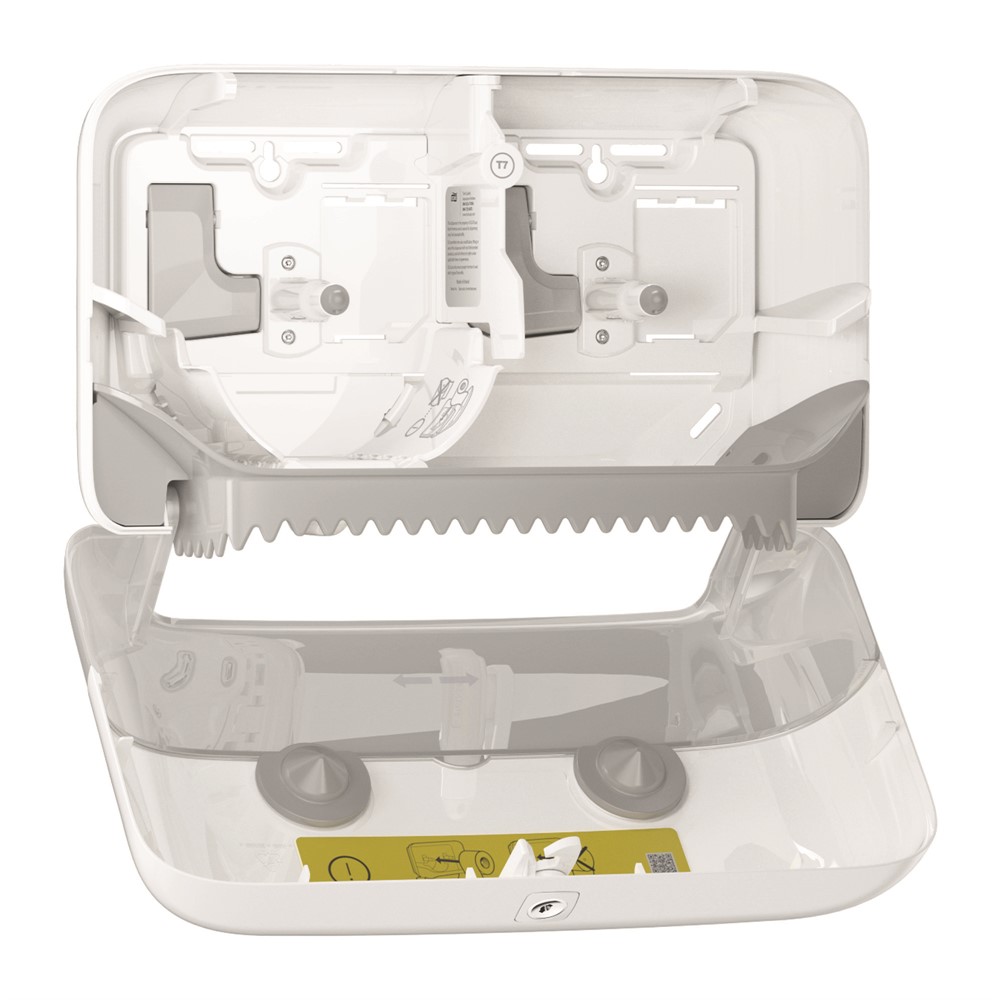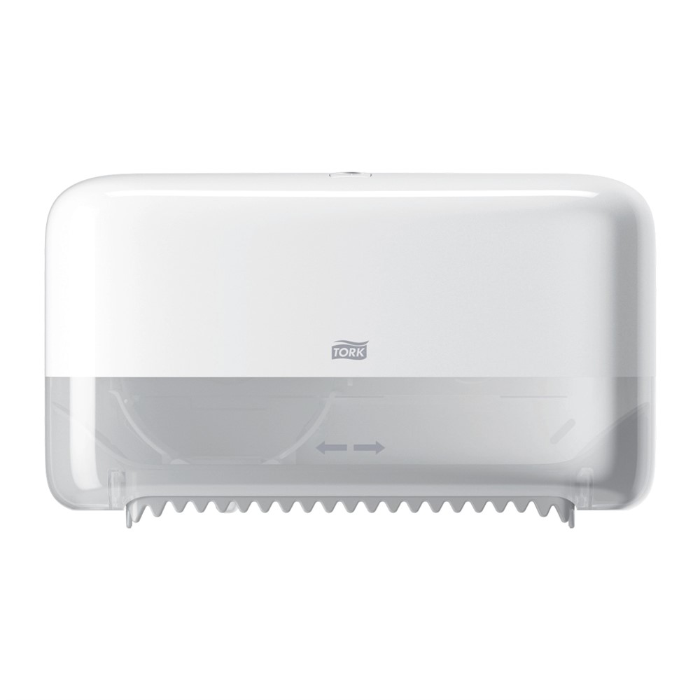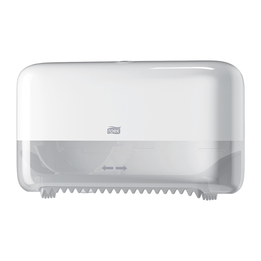 Dispenser Tork Coreless Twin för toalettpapper T7 utan hylsa. Kompakt och utrymmessnål design, passar även mindre toalettutrymmen. Vit plast. Mått (HxBxD) 20,7x36x13cm.