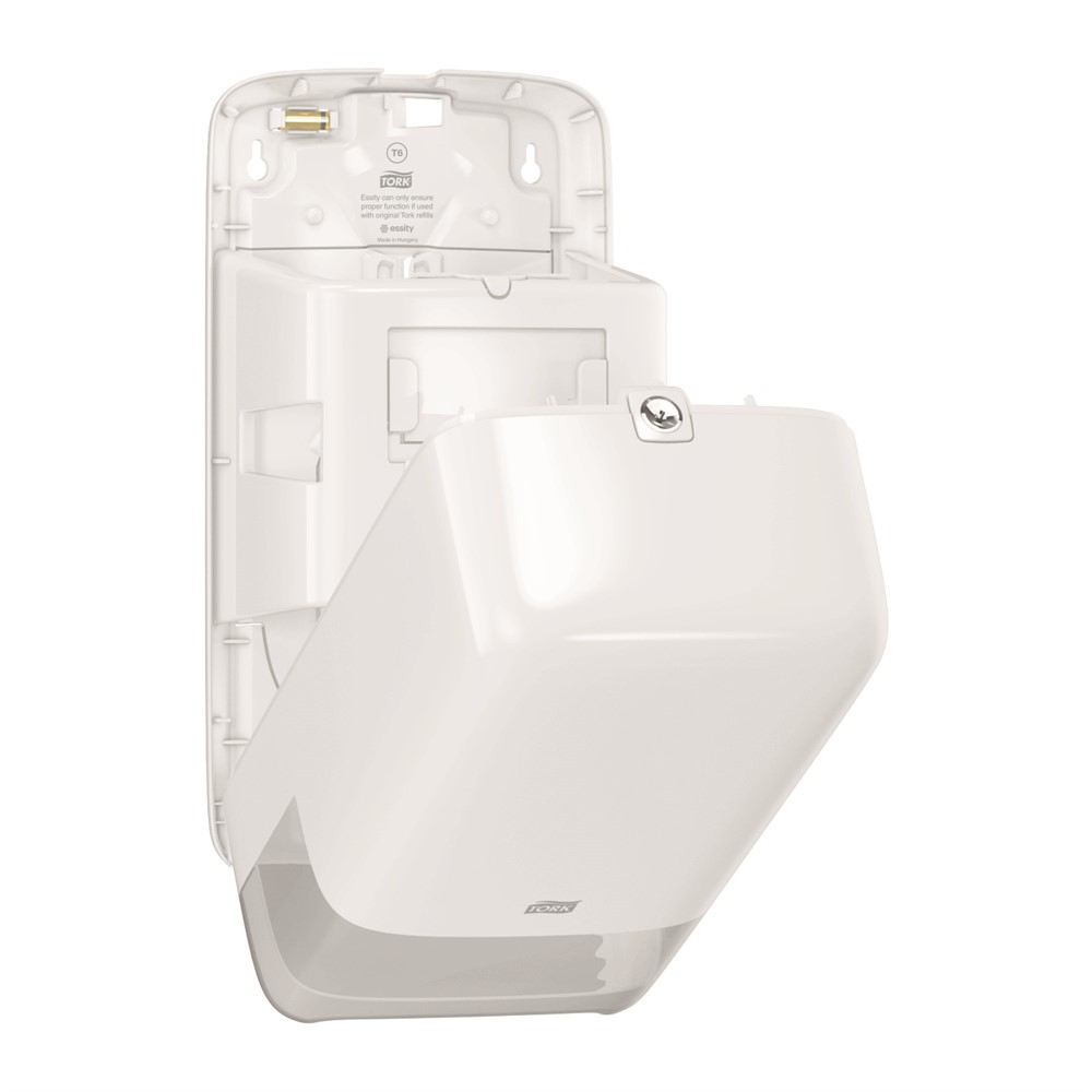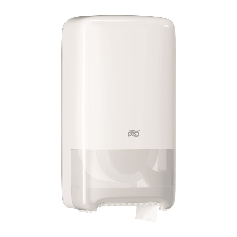 Dispenser Mid-size för toalettpapper T6 för hög effektivitet med plats för upp till sex gånger mer papper som två vanliga toalettrullar. Vit plast. Mått (HxBxD) 34,4x18,4x14cm.