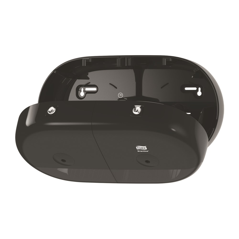 Dispenser med plats för två rullar. Matar ut ett ark i taget. Svart plast. Mått (HxBxD) 22,1x38,9x15,6cm.