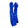 Kemikalieskyddshandske i PVC (vinyl) med 0,3mm chem-layer, sandad greppyta och sömlöst bomullsfoder. Extra lång modell, lämplig för grövre arbeten. Vattentät och latexfri. Passar utmärkt i kemiska riskmiljöer samt mikrobiologiska, hälsofarliga, frätande, våta, smutsiga, oljiga och fuktiga miljöer. Används i VVS-installationer och inom petrokemi, kemiska och kemtekniska arbeten, pappersindustrin, saneringsarbeten, renhållning, lokalvård, laboratoriearbete, fiskeindustrin och marina miljöer. Längd handske 700mm. Cat III. AQL 0,65. Blå. 6par/bunt.