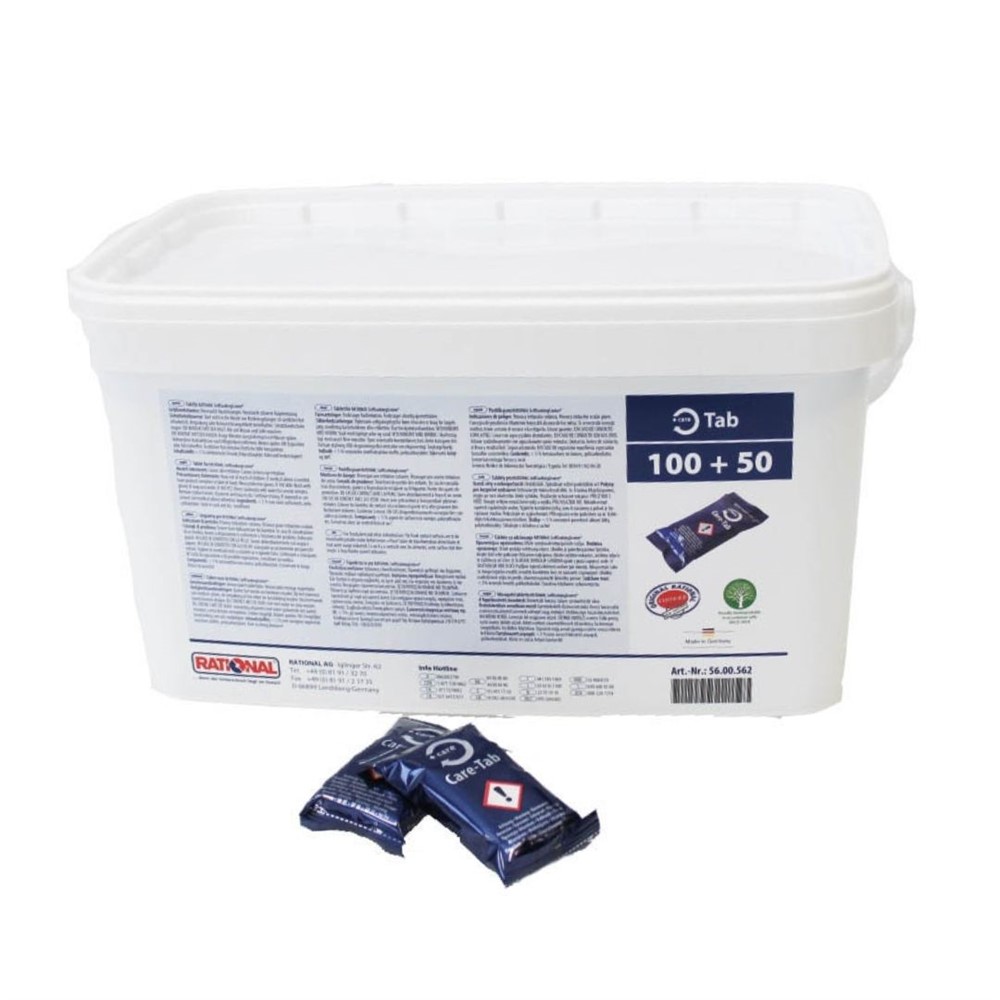 Rengöringstabletter Care Tabs för rengöring av Rationals ugnar iCombi Pro, iCombi Classic och SelfCookingCenter med Efficient Care Control. Innehåller även avkalkningsmedel. Med vårdande ämnen som aktivt motverkar kalkavlagringar i ugnsutrymmet och ånggeneratorn. Högsta driftsäkerhet utan vattenavhärdning och dyr manuell avkalkning. Blå förpackning. Hink 6kg innehåller 150st tabletter.