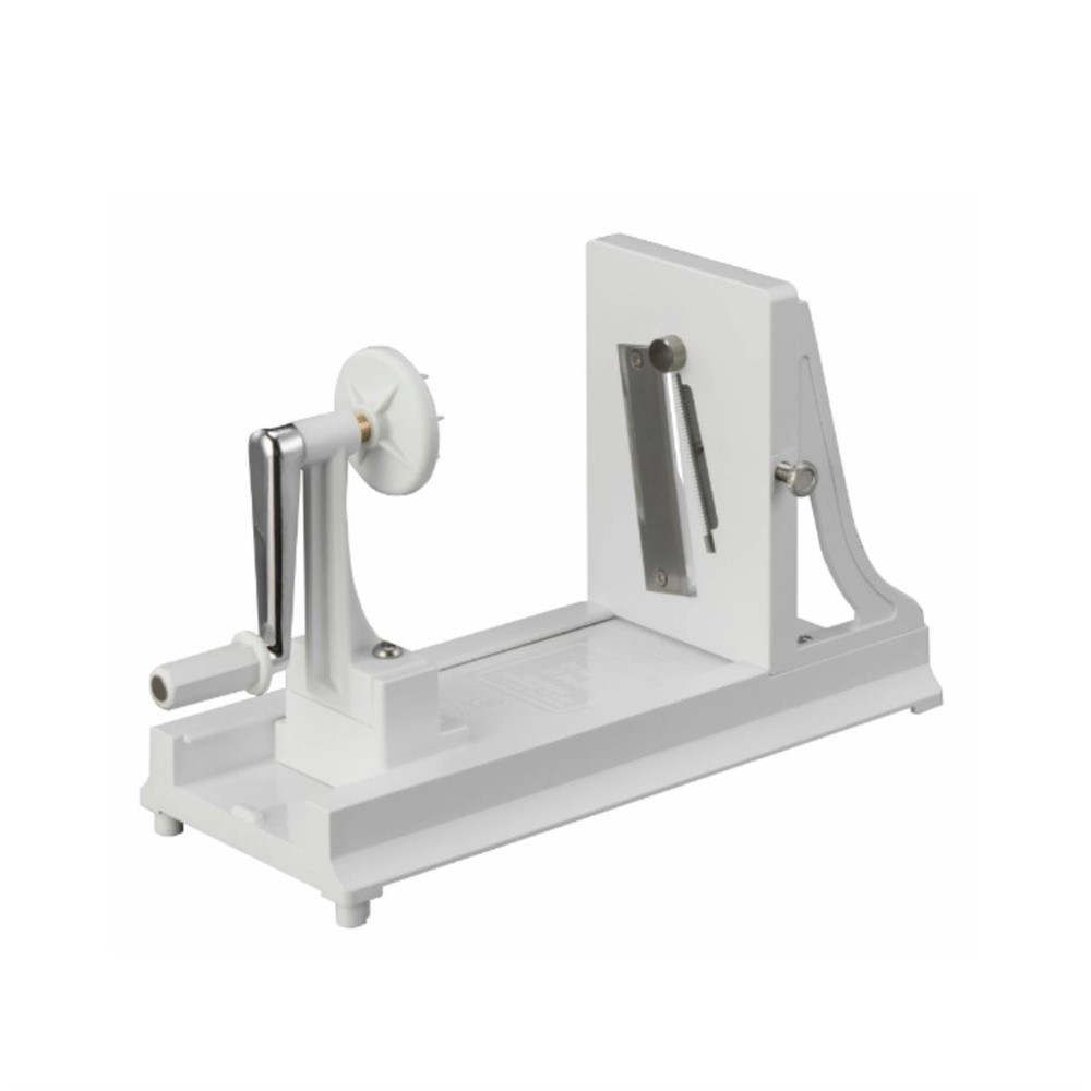 Horisontell grönsakssvarv med omslipbart blad. Skivar 2 mm och har två stimmelblad vilka strimlar 1,2 mm respektive 4 mm. Använd svarven till att skära tunna spiraler eller till att kärna ur stavar från råvarans mitt. Svarven klarar att svarva grönsaker upp till 170 mm samt att kärna ur 12 mm. Den är lätt att ta isär för disk. Handdisk rekommenderas.