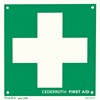 Efterlysande varselskylt "Första hjälpen" i hårdplast. Lyser i mörker efter uppladdning i dagsljus eller annan ljuskälla. Dubbelsidig för montering av flaggskylt eller hängande från taket. Lagkrav för vissa produkter. Mått 20x20cm.