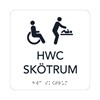 Taktil skylt "HWC/skötrum". Taktila skyltar har förutom ett pictogram punkter som kan läsas av synskadade. Mått 15x15cm. Vit med svart text.