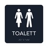 Taktil skylt "Toalett". Taktila skyltar har förutom ett pictogram punkter som kan läsas av synskadade. Mått 15x15cm. Svart med vit text.