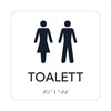 Taktil skylt "Toalett". Taktila skyltar har förutom ett pictogram punkter som kan läsas av synskadade. Mått 15x15cm. Vit med svart text.