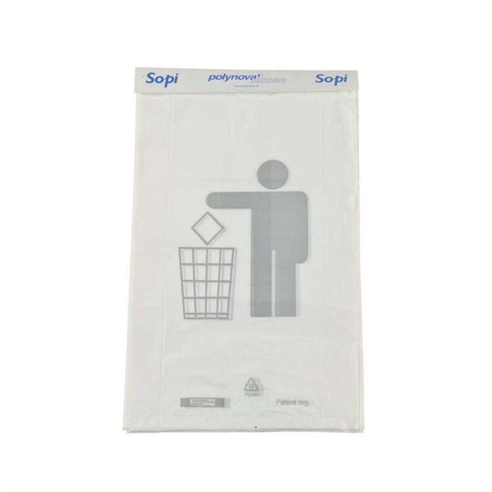 Blockade soppåsar Sopi i HD-plast som fäst på metallhållare. Passar perfekt på tåg, bussar, bilar och kontor. Vita påsar med pappryttare. Mått 215/150x350mm. 25st påsar/block. 100st block/fp.