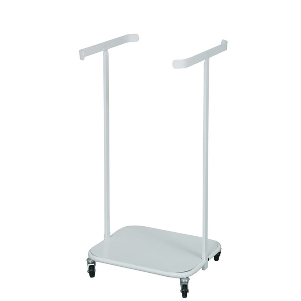 Hållare för 125 liters polyetensäckar. Med hjul och vita bågar i pulverlackerat stål. Lämplig för inomhusbruk.